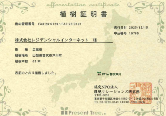 当社では創業20周年を記念し、「RIXIOエコプロジェクト」と称した環境保護活動への取り組みを開始いたしました。※詳しくはこちらのページをご覧ください。 弊社インターネット回線サービス「RIXIO」の売上の一部を植樹活動へ寄付することで、「RIXIO」の導入5棟につき1本の樹が植えられます。 そしてこの度、山梨県笛吹市芦川町へ63本の植樹が完了したことをご報告いたします。(植樹証明書発行日付2025年12月15日) 今後も一企業として環境保全への意識を強く持ち続け、持続可能な社会作りに貢献してまいります。